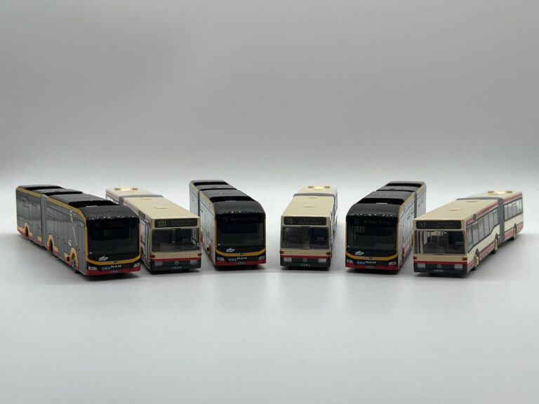 Ab sofort gibt es fünf der sechs neuen 1:87-Modelle – drei moderne MAN Lion’s City 18 E und zwei historische O 405 GN2 – im
